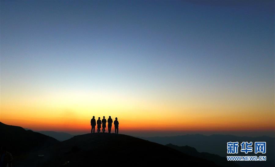 11月2日,游客在摩天嶺草場欣賞夕陽景色(無人機拍攝)。金秋時節,廣西融水苗族自治縣桿洞鄉堯告村的摩天嶺草場天高云淡,景色迷人。新華社記者周華攝
