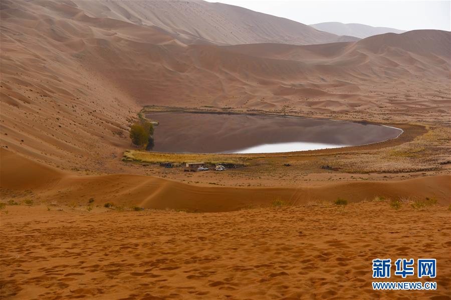 陰雨中的沙漠湖泊,常常讓人以為是一面鏡子(10月18日攝)。巴丹吉林沙漠位于內蒙古西部阿拉善盟,是中國第三大沙漠,沙丘起伏的曲線陡變成高聳的沙山,碧藍的湖泊散落在沙海間。新華社記者李仁虎攝