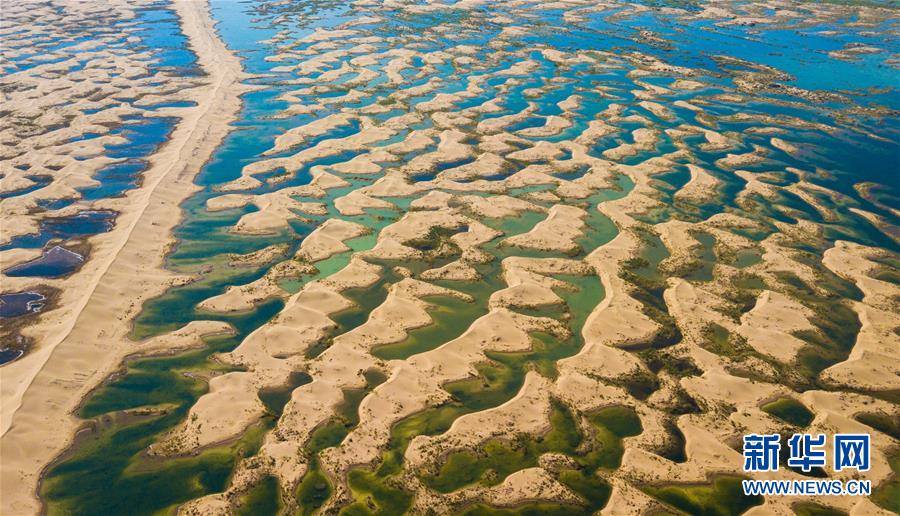 在內(nèi)蒙古鄂爾多斯市杭錦旗境內(nèi)的庫布其沙漠腹地,由凌汛期的黃河水匯聚而成的濕地在日光照射下顯示出絢麗多彩的顏色(6月9日無人機(jī)拍攝)。