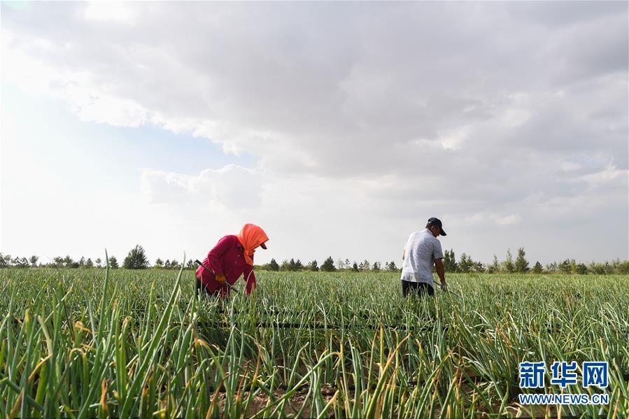 工人在內蒙古鄂爾多斯市杭錦旗阿木古龍產業園區為蔬菜除草(8月1日攝)。該地示范發展沙漠節水現代農業,增加了農牧民收入。