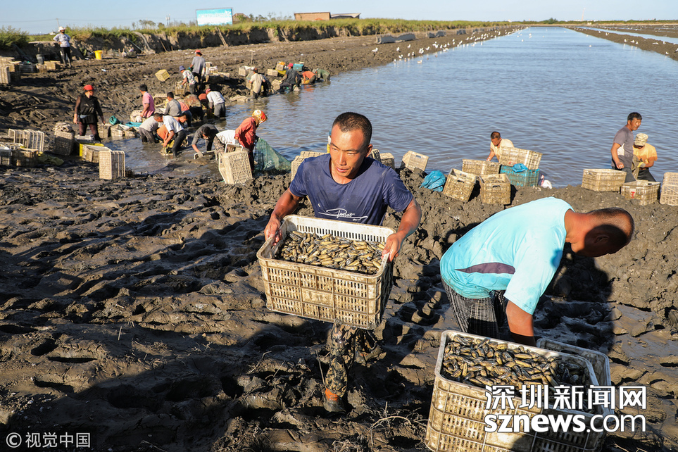 緊挨著黃海的大片養殖區,因為一條濱海大道,被自然劃成南北兩個部分。挖蟶人從四面八方趕來,或集體包車、或自駕摩托。這些機動車密密地停靠在濱海大道一側,綿延數公里。