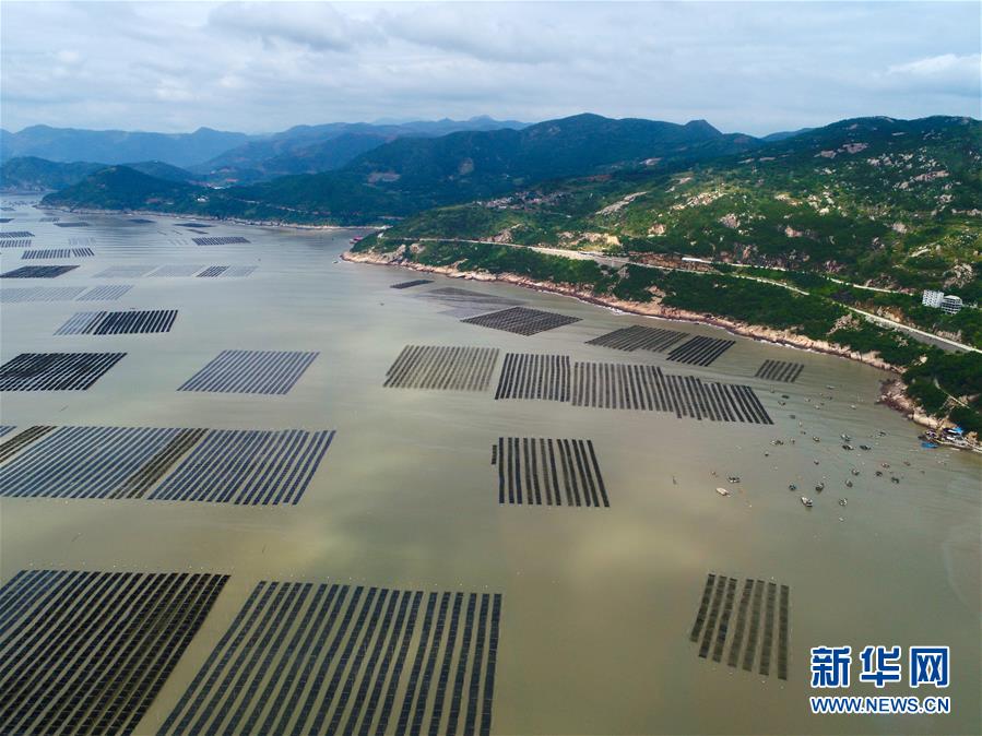 這是11月4日無人機拍攝的霞浦縣三沙鎮的紫菜種植區。 近日,福建省霞浦縣沿海6萬畝紫菜迎來收獲季節,漁民們出海收獲紫菜,海上田園一派繁忙豐收景象。 新華社記者 姜克紅 攝