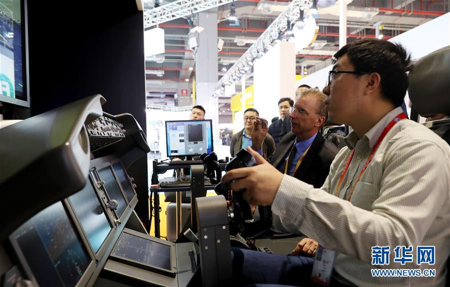 11月5日,一名參觀者在美國波音公司展臺體驗787機(jī)型的模擬駕駛艙。 新華社記者 方喆 攝