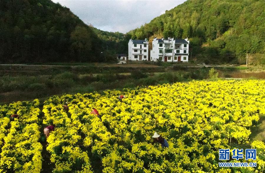 11月8日,婺源縣思口鎮農戶在采摘皇菊(無人機拍攝)。 新華社記者 胡晨歡 攝