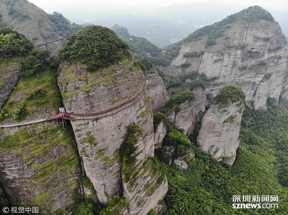 深圳新聞網訊 2018年6月19日,航拍江西贛州南武當山百米高空玻璃棧道。棧道緊貼峭壁,在懸崖之上凌空蜿蜒穿行,猶如一條玉龍盤旋在綠林石海之中。 南武當山位于江西最南端的龍南縣武當鎮境內,景區核心面積達到13.5平方公里,擁有99座千姿百態的巍峨石峰,丹霞地質風貌突出,連綿十里,被稱為“武當十里畫廊”。