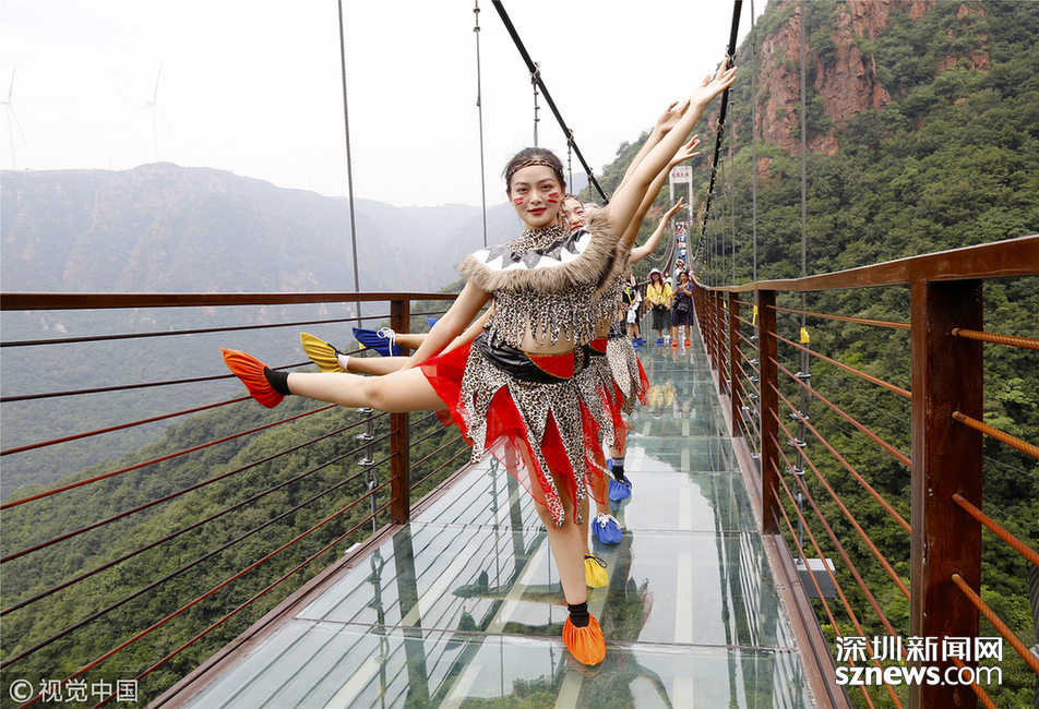 2018年6月30日,鄭州新密一景區的玻璃吊橋上,幾名美女大學生身穿“野人”服裝練習瑜伽,吸引了眾多游客的圍觀。據了解,這些大學生來自鄭州。
