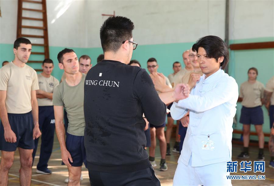 11月13日,在馬耳他首都瓦萊塔,鄭祖杰(前右)向馬耳他士兵展示詠春拳。 當日,中國國家級非物質文化遺產詠春拳代表性傳承人鄭祖杰走進馬耳他武裝部隊,向官兵展示詠春拳。這一活動是馬耳他中國文化中心與馬耳他武術協會合辦的詠春拳系列展示活動之一。 新華社記者 袁韻 攝