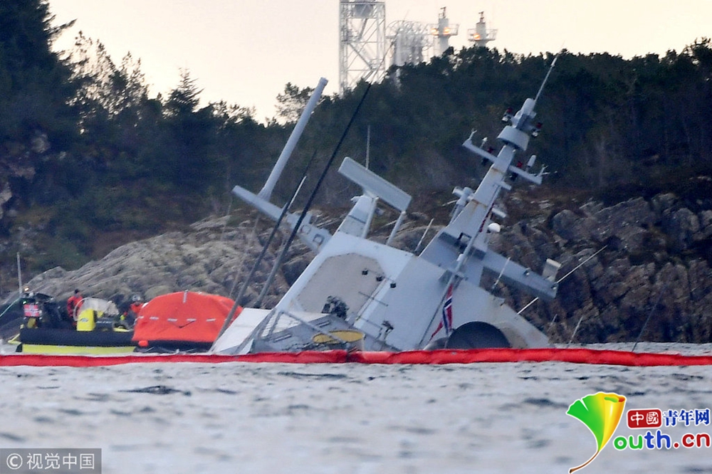 當地時間2018年11月13日,挪威卑爾根,挪威海軍護衛艦“海爾格·英斯塔”號在挪威西部海域被打撈出水,這艘軍艦于11月8日與一艘油輪相撞后傾覆。