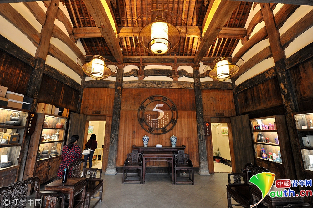 大廳兩邊的櫥窗里擺放著不少書籍,還有眾多售賣的精美紫砂壺、手工編織提包等商品。