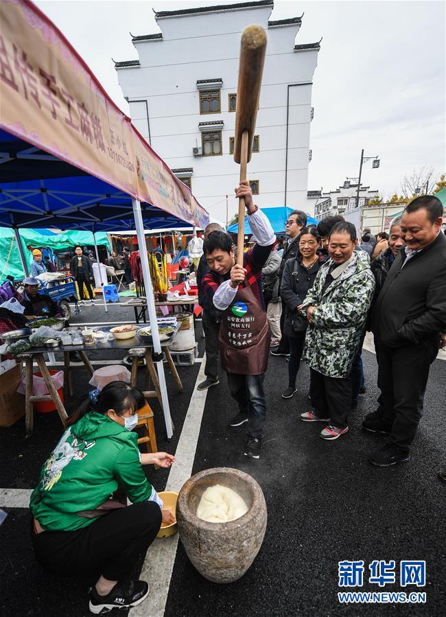 11月19日,商戶在廟會現場展示傳統打年糕。 新華社記者 徐昱 攝