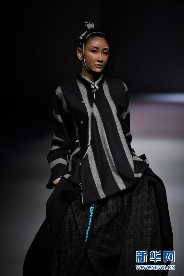 模特在AJ-NAMO藏裝秀上展示藏族設計師阿佳娜姆設計的時裝(11月18日攝)。 新華社記者 普布扎西攝