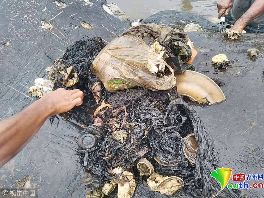 當地時間2018年11月19日,印尼瓦卡托比,當地發現一頭擱淺的鯨,肚子里滿是塑料垃圾。它的腹中有12斤塑料垃圾,其中包括115個杯子。