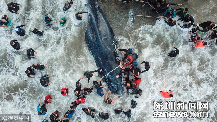當(dāng)?shù)貢r(shí)間2018年4月9日,阿根廷馬德普拉塔,一條鯨魚在當(dāng)?shù)睾R淺,雖經(jīng)民眾合力救助仍最終死亡。