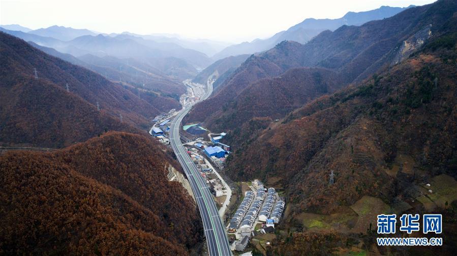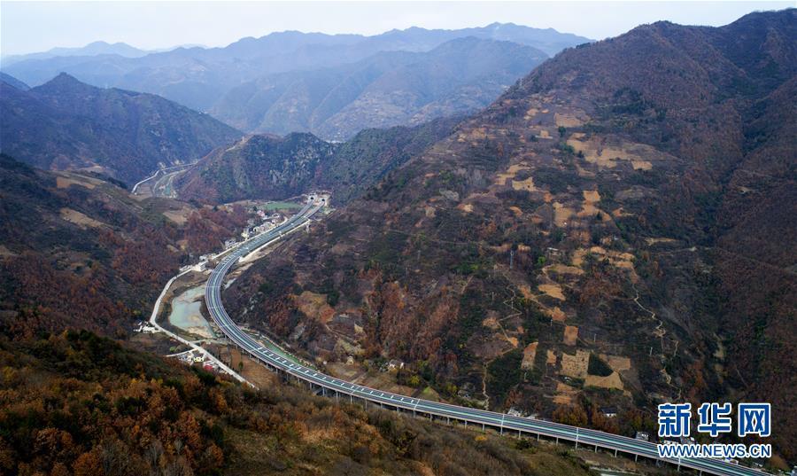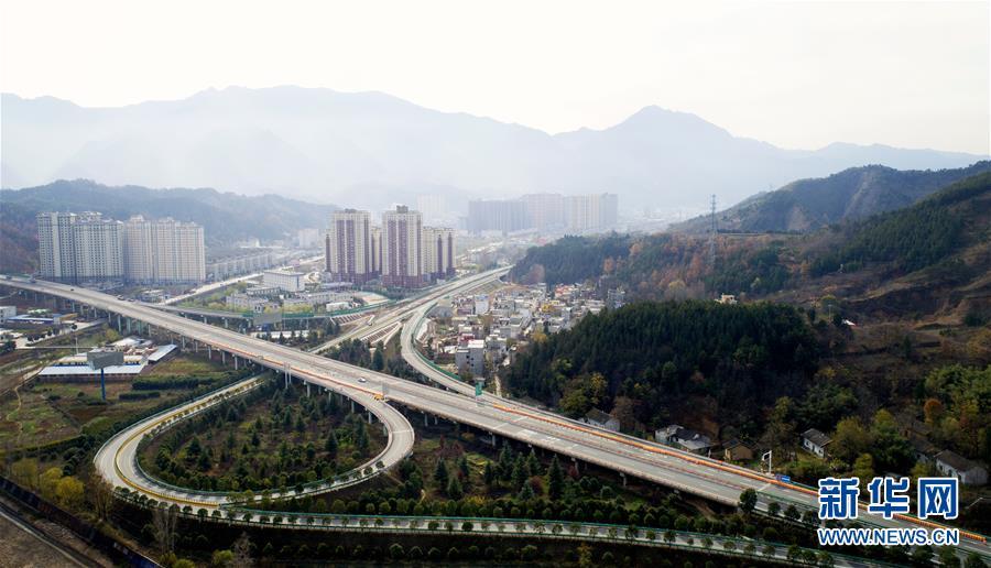 11月20日拍攝的水陽高速公路與福銀高速公路相接的樞紐互通式立交(無人機拍攝)。 近日,記者從陜西省交通建設集團公司了解到,陜西柞水至山陽高速公路已全線貫通即將通車。據介紹,(柞)水(山)陽高速公路全長78.8公里,開通后將實現包茂高速、福銀高速在陜南商洛地區的連接,開辟出秦嶺南麓的一條橫向高速大通道,對完善陜西高速公路路網結構、促進陜南區域經濟發展、加快山區群眾脫貧致富具有重要意義。 新華社記者劉瀟攝