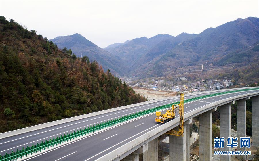 11月20日,在水陽高速公路左家灣特大橋上,橋梁檢測車在進行通車前的檢測作業(無人機拍攝)。 近日,記者從陜西省交通建設集團公司了解到,陜西柞水至山陽高速公路已全線貫通即將通車。據介紹,(柞)水(山)陽高速公路全長78.8公里,開通后將實現包茂高速、福銀高速在陜南商洛地區的連接,開辟出秦嶺南麓的一條橫向高速大通道,對完善陜西高速公路路網結構、促進陜南區域經濟發展、加快山區群眾脫貧致富具有重要意義。 新華社記者劉瀟攝