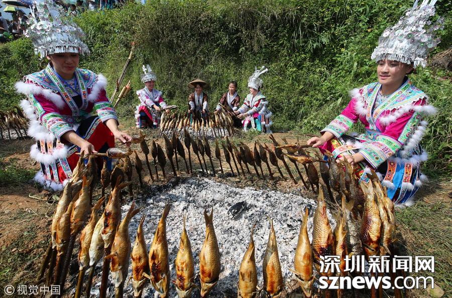 深圳新聞網(wǎng)訊 2018年9月15日,廣西柳州市融水苗族自治縣喜迎中國(guó)首屆“農(nóng)民豐收節(jié)”——2018金秋燒魚季啟動(dòng)儀式在桿洞鄉(xiāng)花孖苗寨舉行,數(shù)百名苗族群眾和游人共同開展了水田拔河、田間捉魚、傳統(tǒng)打谷和燒魚等活動(dòng),慶祝豐收。