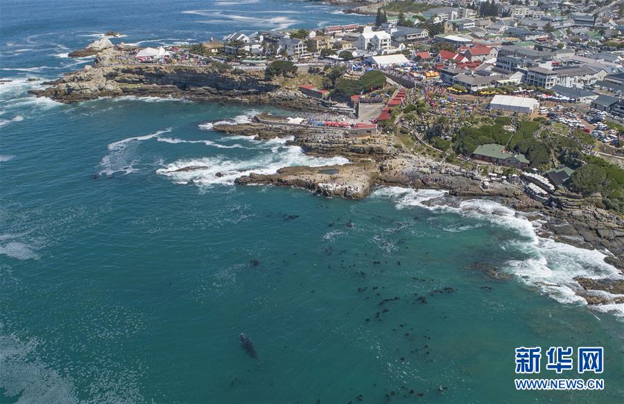 9月30日,在南非赫曼紐斯小鎮附近海面上,南露脊鯨在海岸邊暢游。9月29日,位于開普敦以東約115公里的赫曼紐斯小鎮迎來2018年的鯨魚節,來自世界各地的游客可乘船出海觀鯨,也可在岸邊等待鯨魚的到來。新華社記者陳誠攝