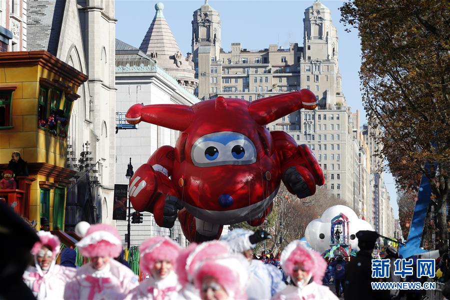 11月22日,在美國紐約感恩節大游行上,“超級飛俠樂迪”造型氣球行進在曼哈頓街頭。