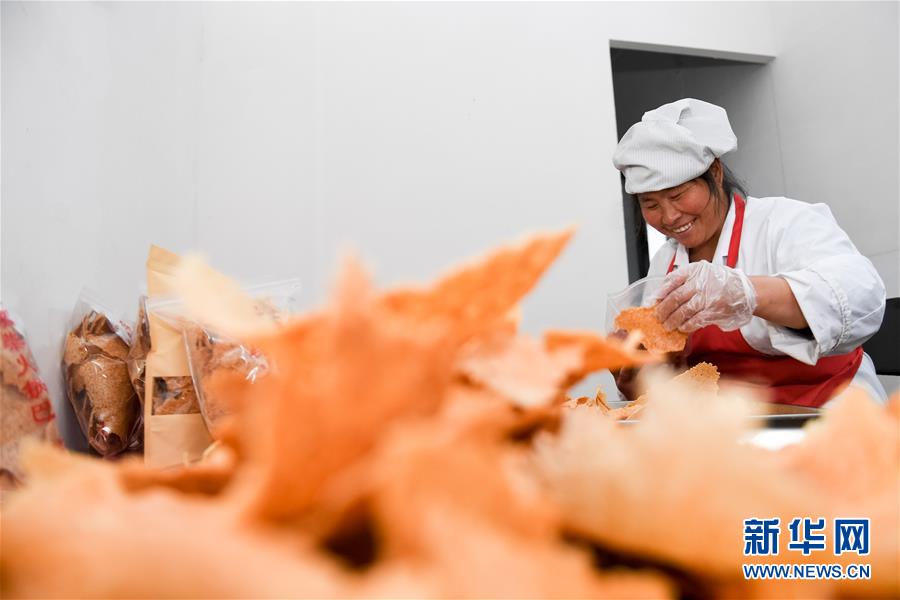 11月22日,姚新花在鍋巴廠里包裝鍋巴。新華社記者張端攝