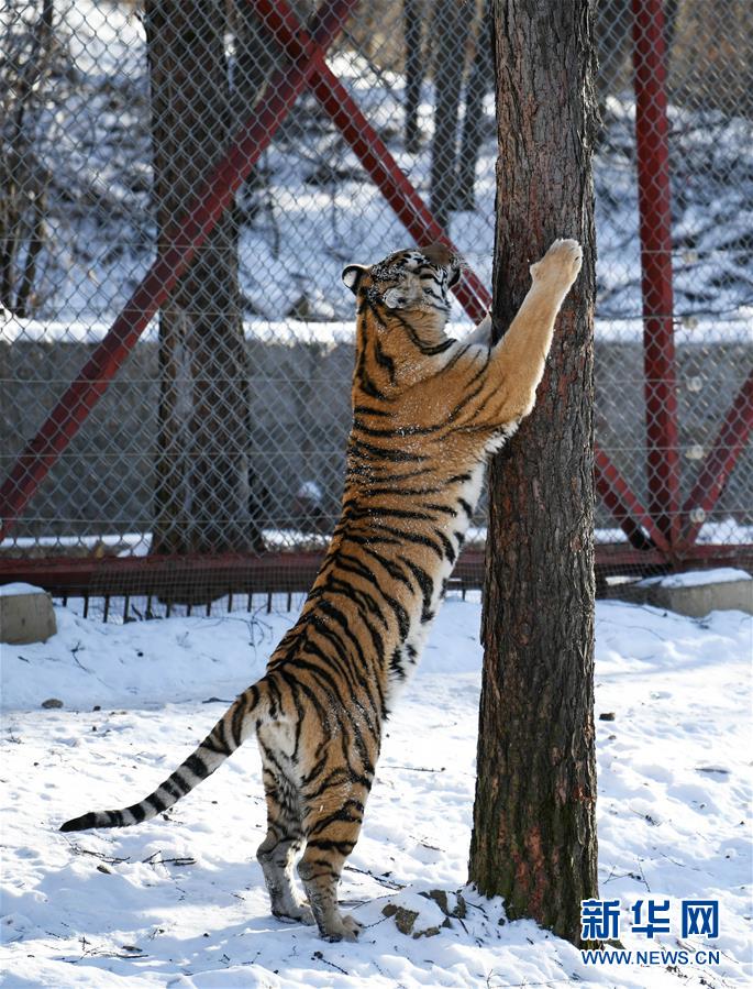 在橫道河子東北虎林園散放區,一只東北虎在練“爪子”(11月21日攝)。新華社記者王建威攝
