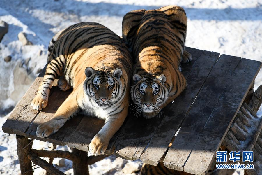 在橫道河子東北虎林園散放區,兩只東北虎在木架子上休息(11月21日攝)。新華社記者王建威攝