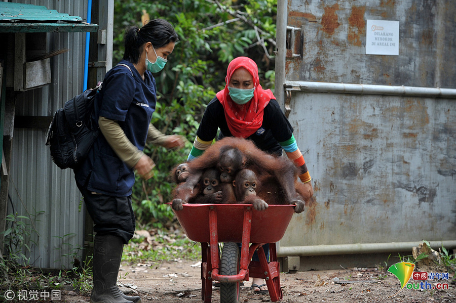 當地時間2018年9月18日,印尼加里曼丹克塔邦,國際動物救援(IAR)猩猩安全與保護中心里,飼養員用獨輪車把猩猩寶寶送到森林學校。圖片作者:Newscom