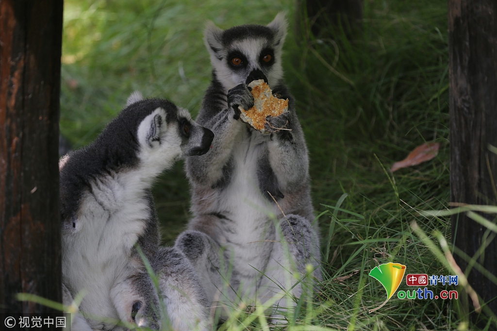 2017年10月4日,重慶永川樂和樂都的動物飼養員給環尾狐猴喂食月餅。