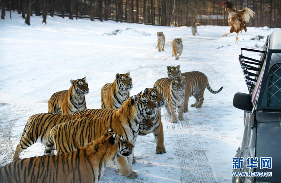 在橫道河子東北虎林園散放區,一群東北虎準備捕食投放的活雞(11月21日攝)。新華社記者王建威攝