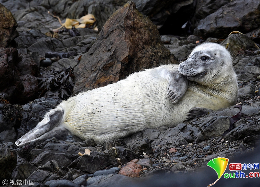 中國青年網北京10月9日電 當地時間2018年10月8日,英國彭布羅克郡,一只大西洋海豹幼崽躺在海邊礁石上。海豹幼崽出生時都有毛茸茸的白色非防水皮毛,它們會在第四周蛻皮。