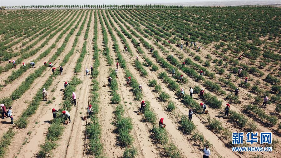 紅寺堡生態移民區的移民在百瑞源枸杞種植基地采摘頭茬枸杞(5月30日無人機拍攝)。近日,在寧夏吳忠市紅寺堡區百瑞源枸杞種植基地,頭茬枸杞迎來采摘收獲季。今年頭茬枸杞采摘期比往年提前20天左右。據了解,該基地地處紅寺堡生態移民區,占地3000畝,采摘季節每天有數百名當地移民在田間采摘勞作。新華社記者王鵬 攝