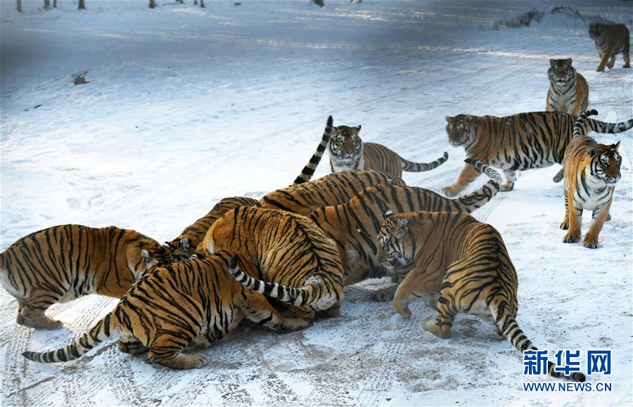 在橫道河子東北虎林園散放區,一群東北虎在搶食投放的活雞(11月21日攝)。新華社記者王建威攝