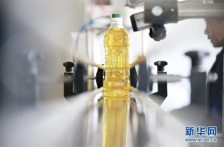 11月23日,在廣西柳州三江侗族自治縣一家生物科技公司,工作人員在茶油灌裝生產線上忙碌。新華社記者任正來攝