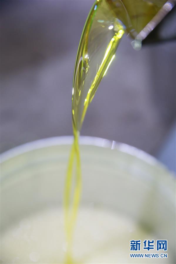 11月22日,在廣西柳州三江侗族自治縣斗江鎮一茶油加工點,新榨的茶油從榨油機流出。新華社記者任正來攝