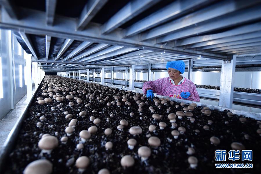 在河南蘭考縣東壩頭鄉(xiāng)張莊村,一位村民正在一個(gè)食用菌企業(yè)的車(chē)間內(nèi)采摘褐蘑菇(6月21日攝)。新華社記者馮大鵬攝