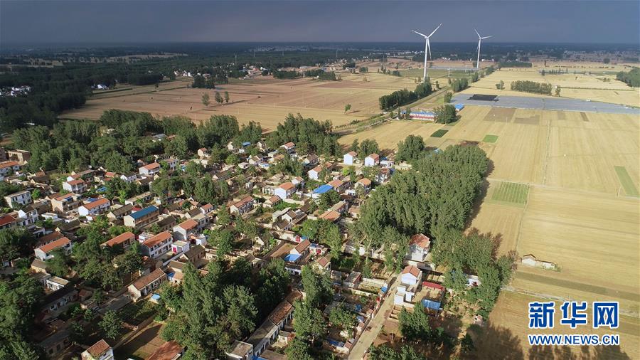 這是6月20日無人機(jī)拍攝的河南蘭考縣東壩頭鄉(xiāng)張莊村周圍的麥田和風(fēng)機(jī)。新華社記者馮大鵬攝