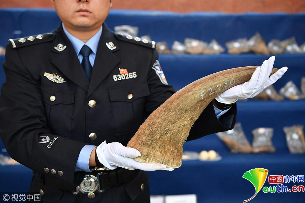 11月23日,現場展示警方查獲的野生動物制品。當日,昆明市森林公安局向媒體通報,破獲一系列特大非法收購出售珍貴瀕危野生動物及其制品案件。