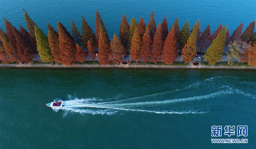 一艘游艇在湖南烈士公園年嘉湖湖面行駛(11月25日無人機拍攝)。新華社記者 李尕攝