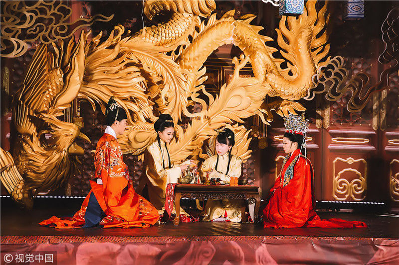 新郎趙佳瑞是嘉興人,今年28歲,比黃聰小兩歲,是一位攝影師。因為曾經給黃聰拍攝漢服,他知道她有很多漢服,就經常向她借漢服給客人拍攝,經常接觸就相戀了。現在夫妻倆在當地開了專門拍攝古風的攝影工作室。工作室就三個人,除了小夫妻,還有黃聰的閨蜜楊曉晨做化妝師。在婚禮上,這些小姐妹都穿上漢服,像一個個漂亮的宮女。