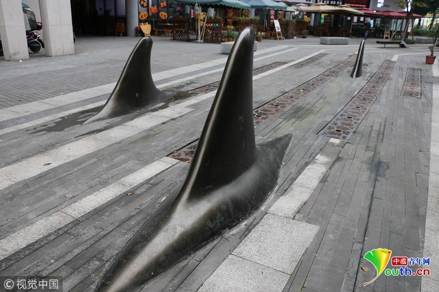 2018年11月20日,重慶一園區內馬路中間突出一排“鯊魚鰭”,司機路人都被“嚇懵”了。突出的鯊魚鰭將兩側的車行道分開,原來,這是為了進一步保證車流的有序進出和行人過街安全,同時也為了防止亂停車占用人行道,設置了這種異形“隔離樁”。圖片來源:視覺中國