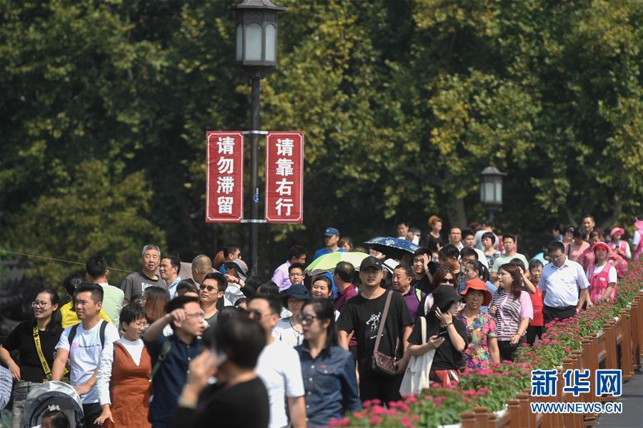 10月7日,游客在杭州西湖風景區涌金門游覽。當日是國慶黃金周最后一天,眾多游客來到杭州西湖景區觀光游覽,熱度不減。據杭州市旅游委員會公布的數據顯示,從10月1日起截至10月7日12時,國慶七天杭州市各景區(點)接待游客總量達到1776.14萬人次,其中西湖風景名勝區管委會所屬公園景點共接待游客452.2萬人次。新華社記者 黃宗治 攝