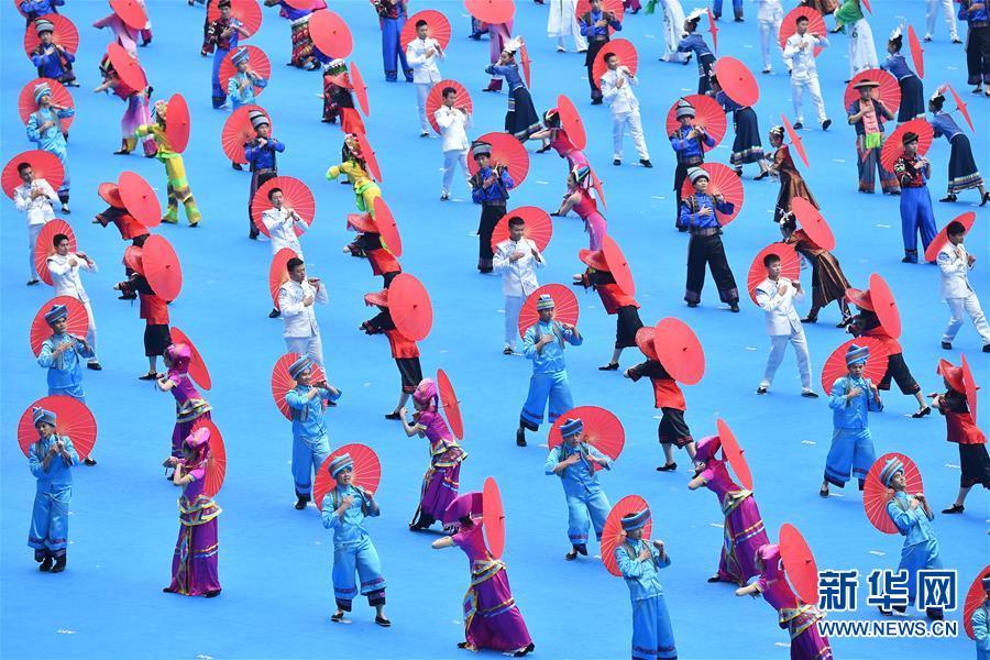 12月10日,廣西壯族自治區成立60周年慶祝大會在廣西體育中心隆重舉行。這是慶祝大會上的群眾文藝表演。 新華社記者 李鑫 攝