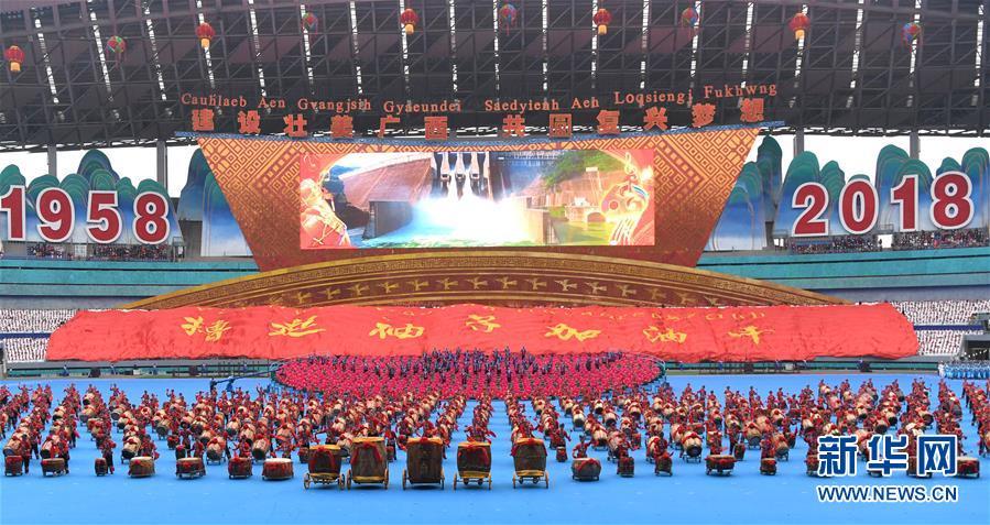 12月10日,廣西壯族自治區成立60周年慶祝大會在廣西體育中心隆重舉行。這是慶祝大會上的群眾文藝表演。 新華社記者 周華 攝