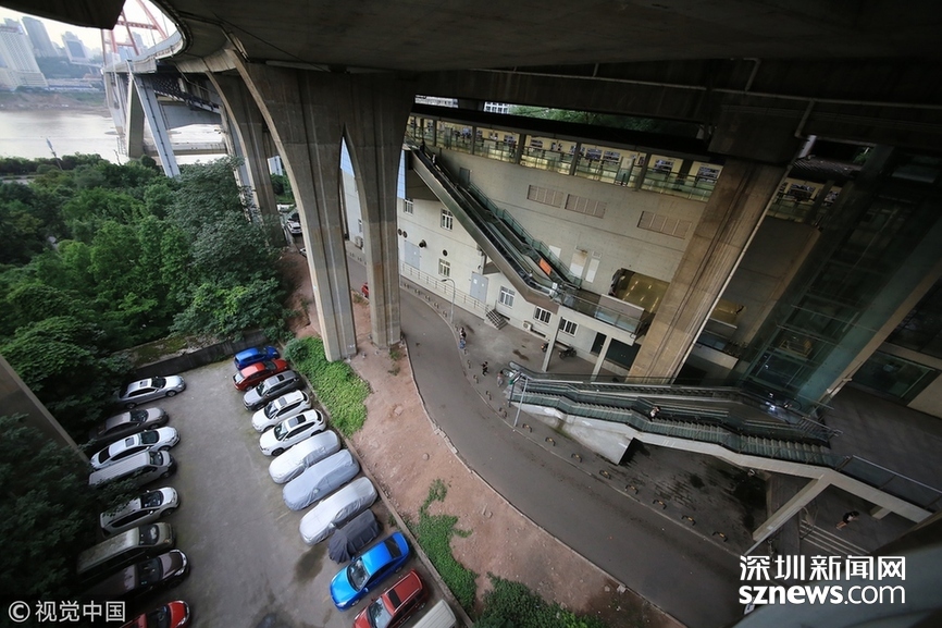 2018年5月29日,重慶,魔幻重慶又雙叒叕放大招!還有一個獨特的亮點,重慶軌道交通3號線銅元局站,出口由一段長梯銜接上方立交橋和下方的路面,與全國最高城市立交橋蘇家壩立交組成了獨特風景,許多游客專門趕來拍照。