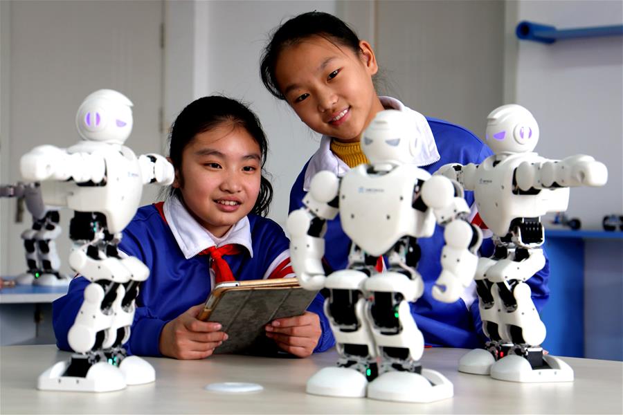 12月19日,武安市淑村鎮白沙學校的學生在練習操作機器人。新華社記者王曉攝