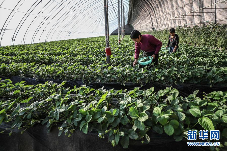 12月19日,農戶在大棚里管理草莓。 2017年5月,遼寧省鐵嶺市昌圖縣大四家子鎮方家船口村利用土地確權成果,由村兩委班子成員領辦創辦了昌圖久晟果木蔬菜種植專業合作社。到2018年9月,合作社利用產業扶貧資金、壯大村集體經濟扶持資金、村集體用地和村民入股資金建成了11個“股份制大棚”,主要種植草莓等作物,產品通過電商銷往云南、四川、北京、上海等地,預計第一期可為265名貧困戶每人分紅860元。 新華社記者潘昱龍攝