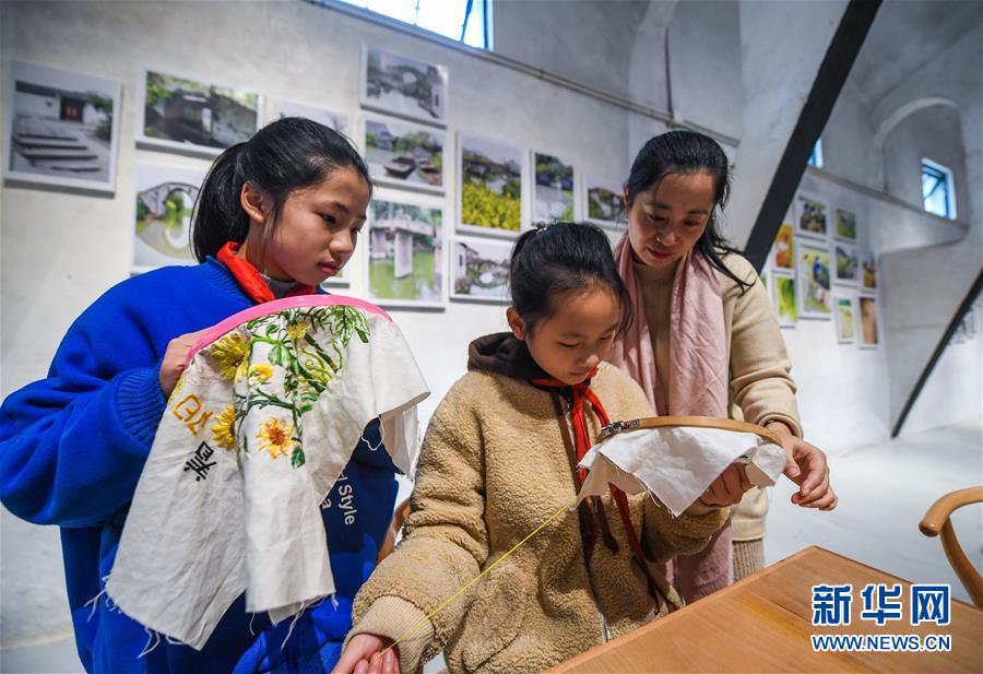 12月20日,學生在舊糧倉改建的“漾西書吧”內學習傳統刺繡。 新華社記者 徐昱 攝