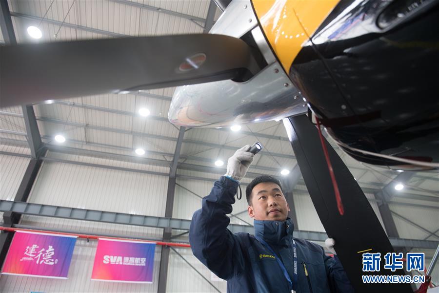 12月20日,在建德市航空小鎮,工作人員對一架大棕熊100系列飛機進行日常維護。 當日,浙江省建德市航空小鎮通航制造板塊首架飛機下線交付。此次下線交付的大棕熊100系列Ⅱ飛機由美國Quest飛機制造公司出品,有望在通用航空領域發揮作用。建德市自2016年開始航空小鎮創建,2017年被列入全國第二批特色小鎮名單。 新華社記者翁忻旸攝