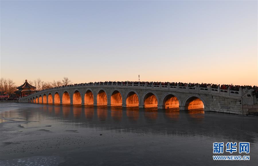這是12月23日拍攝的頤和園十七孔橋“金光穿洞”美景。 當日,北京頤和園十七孔橋出現“金光穿洞”美景,吸引許多游客和攝影愛好者前來觀賞拍攝。 新華社記者陳曄華攝