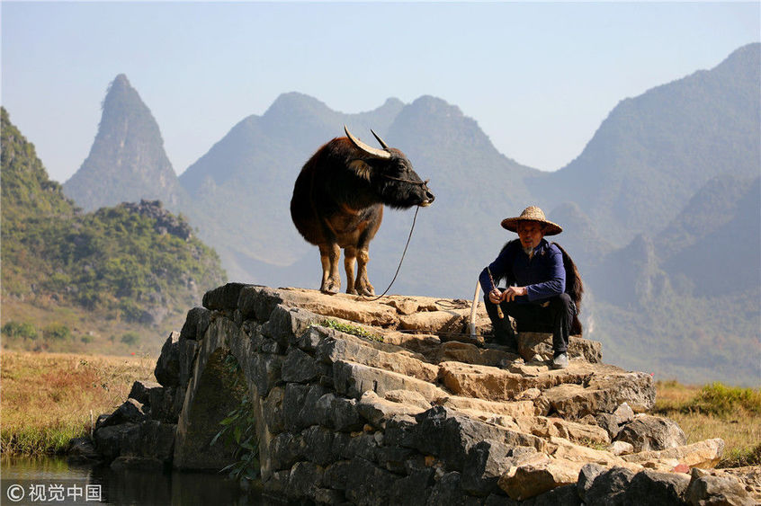 2018年12月17日,廣西桂林。用不到3年時間,農民許修保愣是將自己家的水牛訓練得走上了貓步,這讓來自全國各地的游客嘖嘖稱奇:你這么牛,維密天使情何以堪?憑著與水牛的聯袂演出,一個月下來,老許會有兩三萬的收入進賬,佩服得左鄰右舍紛紛向他伸出了大拇指。棋簿紫/視覺中國