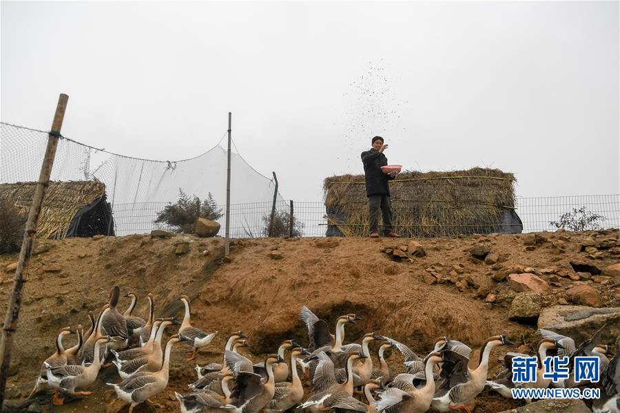 12月22日,王三益在給受傷的灰雁喂食,等到養好傷再將它們放飛。 新華社記者 張端 攝